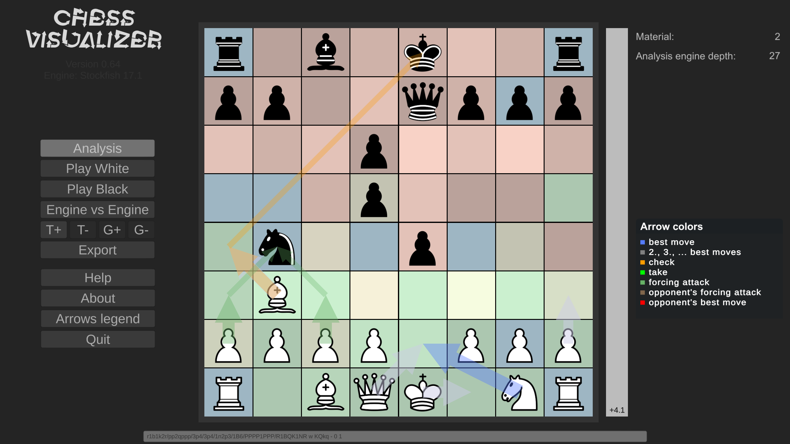 The application helps you analyze chess games by visualizing numerous aspects of positions. It displays arrows and other visual cues that assist in evaluating the current position: blue arrows represent Stockfish engine analysis, while additional arrows indicate forcing moves, good captures, and checks.